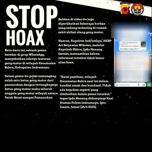 Daerah Kapolsek Sukra Tegaskan Pesan Berantai Ancaman Geng Motor Kepada Pengendara Plat E (Hoax ) Nur 7 Januari 26, 2025 Cybernusa.id – INDRAMAYU Baru-baru ini, sebuah pesan beredar di grup WhatsApp, menyebutkan adanya tawuran geng motor di wilayah Kecamatan Sukra, Kabupaten Indramayu. Dalam pesan itu